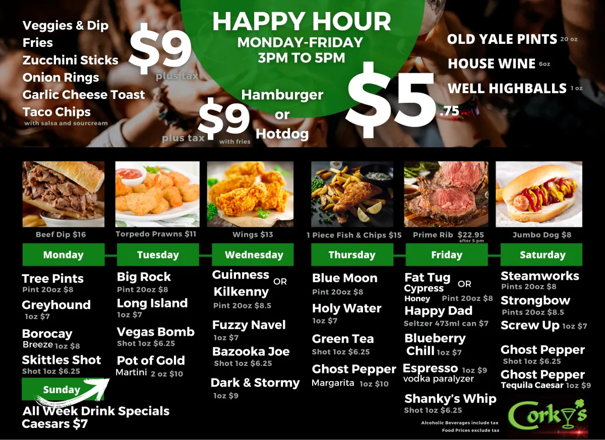 On holidays and special occasions, all specials (yes, even Happy Hour) may disappear without warning. Don’t say we didn’t warn you.
